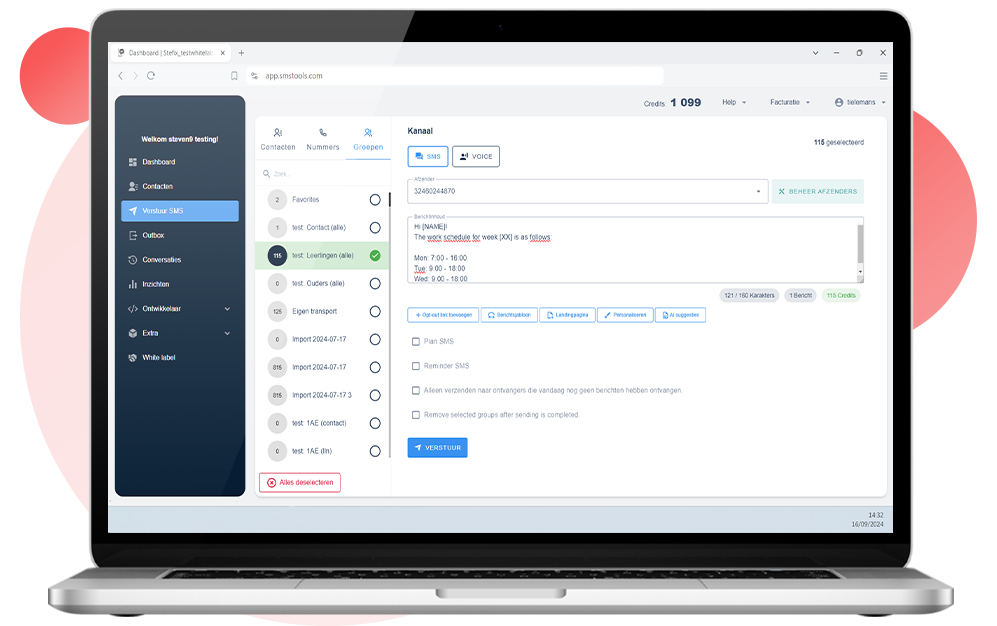 Het Smstools platform is 24 uur per dag en 7 dagen per week beschikbaar en het heeft een uptime van 99,99%. Onze servers worden gehost door Delta Blue NV, één van de betere webhosting aanbieders van België. We maken gebruik van een Cloud hosting met een SLA gold packet. We monitoren ons netwerk en onze diensten continu vanuit ons kantoor in Dilsen-Stokkem (B) en we beschikken over de nodige back-up systemen.